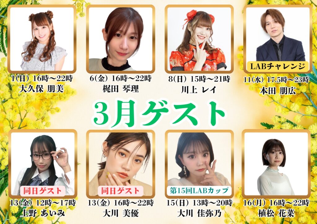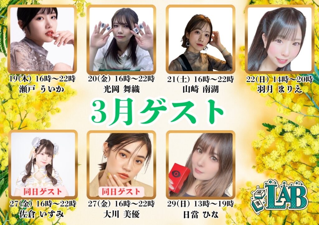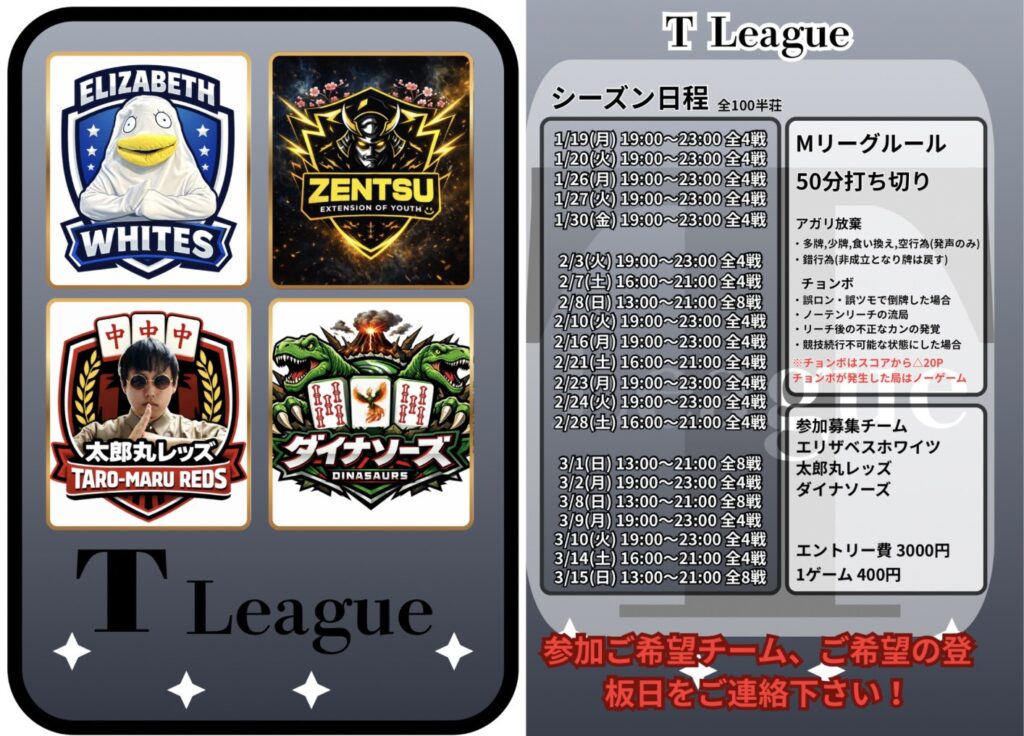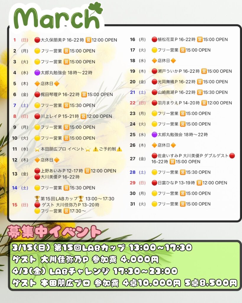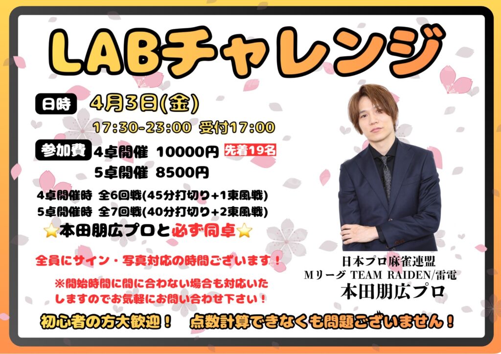 2月イベント情報 3月イベント情報 公式SNSはこちら 麻雀LABとは ノーレートフリー麻雀Mリーグルール電子タバコ喫煙可能(紙たばこ別室)全6卓 最新REXⅢ5卓バーカウンター併設※紙タバコ喫煙可営業時間 12:00〜24:00年中無休 初心者の方大歓迎! 営業時間内であれば、いつでもお一人来られてお金を賭けない麻雀を楽しむことが出来ます。フリーは行ったことがなくて不安な方、点数計算や符計算がわからなくても大丈夫!スタッフが優しくサポートします。 成績管理システム 当店独自の成績管理システムを使用し詳細な個人データを見ることが可能です。 安心・楽しい・また来たい ①安心当店のノーレートフリー麻雀はマナーを重視し、初めてのお客様にも楽しんでいただける「安心」した環境を提供いたします。常連さんや麻雀に慣れている方にも、初心者の方・ビギナーの方を暖かく迎えてもらえるようお店全体で雰囲気作りをしています。 ②楽しい当店の接客は「楽しく」真剣にがモットーです。おひとり様でいらっしゃってもスタッフが会話、対局を通して麻雀の楽しさをお伝えします!全てのお客様に対してスタッフは真剣勝負を挑みます。ノーレート麻雀店だからといって適当な麻雀はいたしません! ③また来たい当店では「また来たい」と思っていただけるよう、様々なイベントを実施しています。・定期的な初心者教室の開催・ゲストプロと麻雀を打てる!・一緒にMリーグや麻雀の動画が見れる!お店の見学も承っておりますので、麻雀に少しでもご興味をお持ちのお客様は、ぜひお気軽に当店へお越しください! ☑️ フリーは初めてで不安や心配🔰☑️ Mリーグを見てやってみたくなった📺☑️ 雀魂(ゲーム)しかやったことがないけど麻雀牌を使って実際にやってみたい🀄️上記のような思いをお持ちのお客様はぜひ当店へお越し下さい!三鷹駅徒歩1分です! SYSTEM 当店はノーレートのフリー麻雀です。電子タバコの喫煙は可能ですが対局中の喫煙はご遠慮ください。 紙たばこ別室になります。 ノーレートフリー 55分打ち切り 1ゲーム 600円 セット 1卓1時間 平日 1200円 休日 1400円 RULE 当店の公式ルールになります。当店はM.LEAGUE(Mリーグ)のルールやコンセプトをお楽しみいただける様にルールを設定させていただきました。 Mリーグのルールはこちら 当店のルールはこちら マナーについてのお願い マナーについてはこちら ACCESS Mリーグ公式ルールノーレートフリー麻雀麻雀LABはJR中央線の三鷹駅徒歩1分! RECRUIT Mリーグ公式ルールノーレートフリー雀荘麻雀LABでは麻雀プロ、又はプロを目指している方!!男性・女性スタッフ募集中です。M.LEAGUE(Mリーグ)への出場を目指しているプロの方やプロを目指している方、男性・女性共に当店でお仕事を一緒にしませんか?是非当店に麻雀のスキルアップや目標へのお手伝いをさせてください。 【募集要項】 雇用形態 正社員またはアルバイト 資格 18歳以上 給与 社員 月給30万円以上 アルバイト 時給1,200円~ 待遇 週休制・シフト制・制服支給・経験者優遇 応募方法 公式ラインまたはお電話にてご応募ください。 070-1426-8271 CONTACT 必須 お名前 必須 メールアドレス お問い合わせ内容